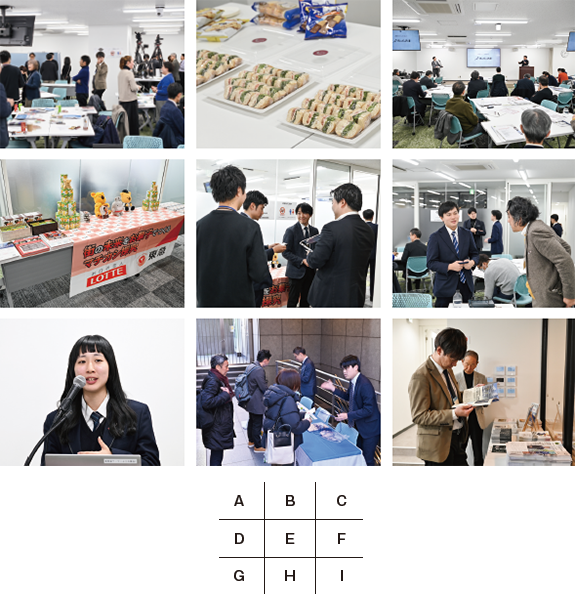 A:サミット講演後は、ネットワーキングタイムで、講演者・受講者同士の意見交換が積極的に行われた。 B:終日参加の受講者は、軽食のケータリングとともに、受講・意見交換を行った。 C:それぞれの講演は、本学教員のファシリテートにより、構想への落としこみを示唆。 D:ロッテと東急のコラボレーションによる探究学習紹介ブース。 E:ロッテと東急のコラボレーションブース前では、多くの質問が寄せられた。 F:本学の院生、修了生、職員に、構想や構想研究に関する質問も多く出た。 G:探究学習の講演では、実際に授業を受けた高校生も発表。 H:1月の冷え込む中、早朝から多くの受講者が、本学会場(青山)へ足を運んだ。 I:新刊「事業構想原論」および月刊誌(事業構想・先端教育)も注目を集めた。