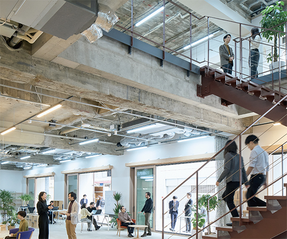 安井建築設計事務所 東京事務所「美土代クリエイティブ特区」「自由・自主・自治・自立・自律」のカルチャーのもと、企画や対話を通じて自ら社会とのつながりを作り成長する設計者を育成し、その活躍の場を提供することを目指した自社オフィス。 1階のまちとつながるスペースは路地側を大きく開放し、地域のための土間的な空間とした。