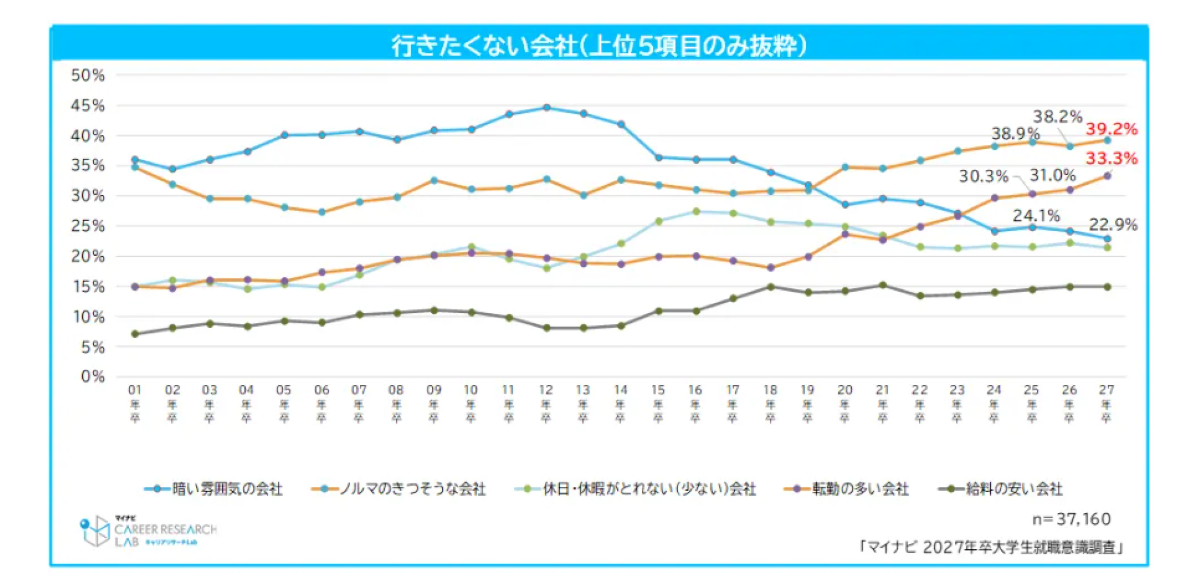 行きたくない会社の条件では、「ノルマのきつそうな会社」が39.2%(前年比1.0ポイント増)で前年に続き最多となった。次いで回答が多かったのは「転勤の多い会社」の33.3%(前年比2.3ポイント増)で、6年連続での増加となっている。背景のひとつとして、将来共働きを希望する学生が増加傾向にあることが挙げられる。転勤は生活拠点の変更を伴うことが多く、自身およびパートナーのキャリア形成にも影響が大きいため、できるだけ避けたいと考える学生が増えている可能性がある。