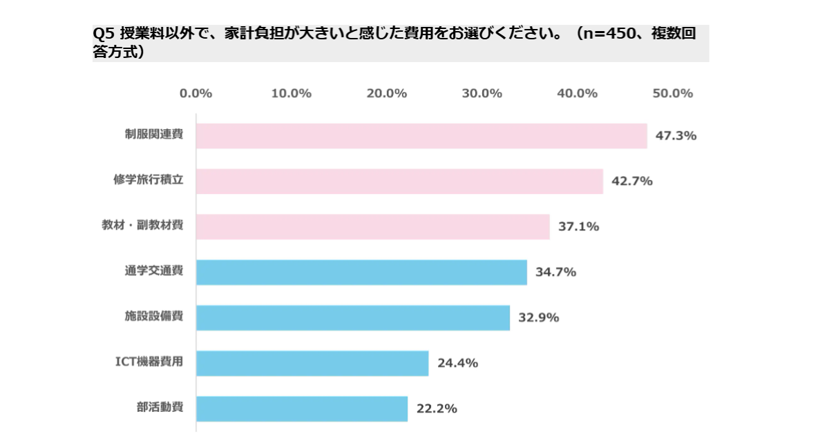 授業料以外で家計負担が大きいと感じた項目については、「制服関連費(47.3%)」が最多となり、次いで「修学旅行積立(42.7%)」、「教材・副教材費(37.1%)」と続いた。
