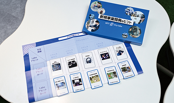 教材「新規事業開発のヒント」。カード裏には「NTTe-City Labo」の多様なソリューションを支える技術が記載されている。